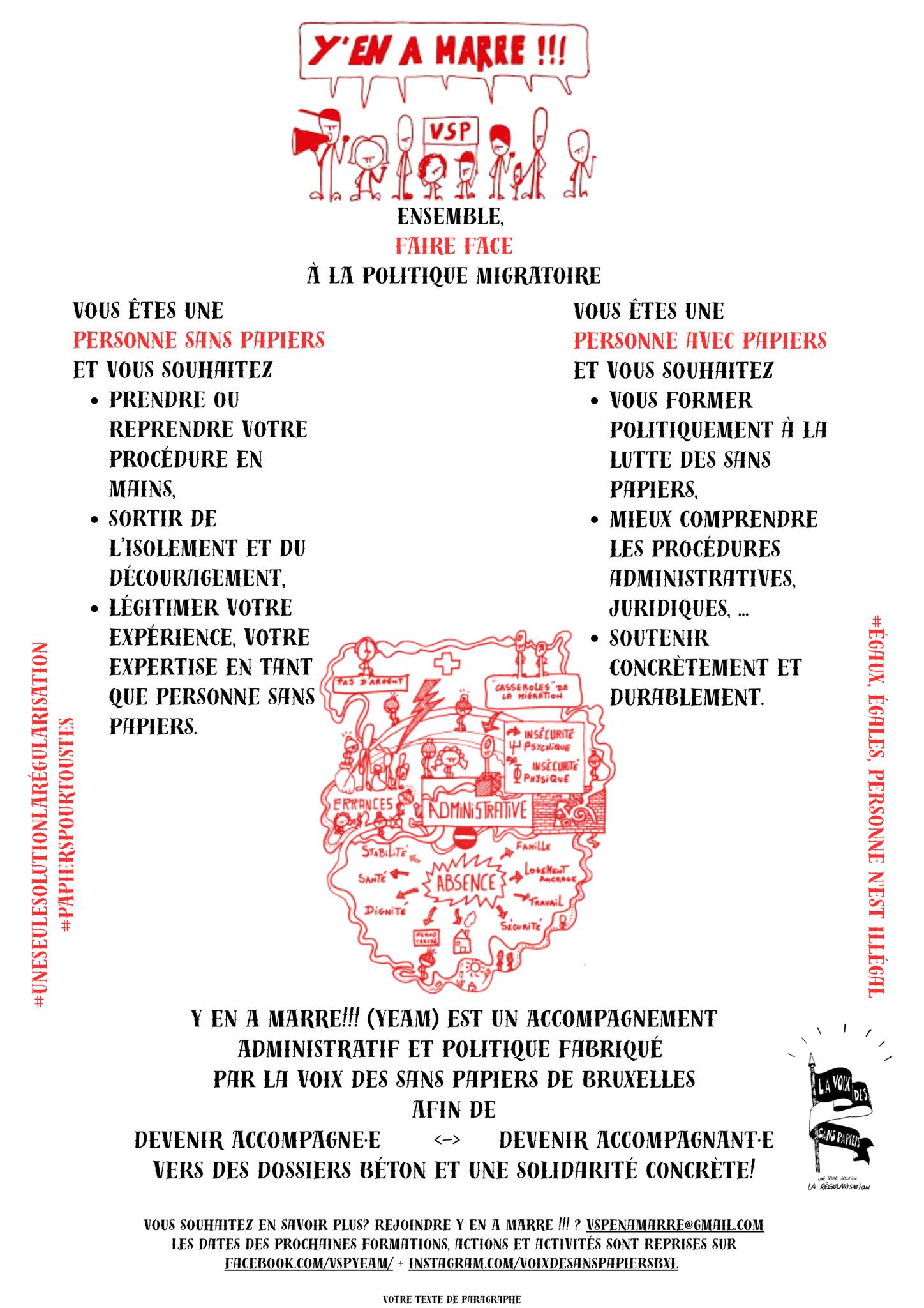 YEAM propose de mettre en lien un.e membre de la Voix des Sans Papiers de Bruxelles avec une personne soutien pour accompagner et renforcer la personne « sans papiers » dans ses démarches juridiques et administratives ainsi que dans sa trajectoire personnelle vers de meilleures conditions de vie et de réappropriation de ses droits.